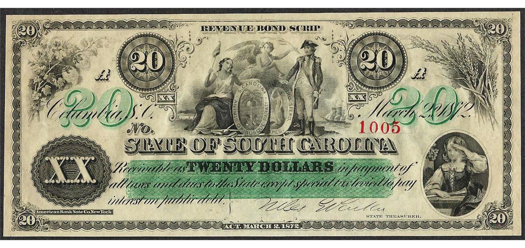 One 1872 $20 State of South Carolina Revenue Bond Obsolete Note.