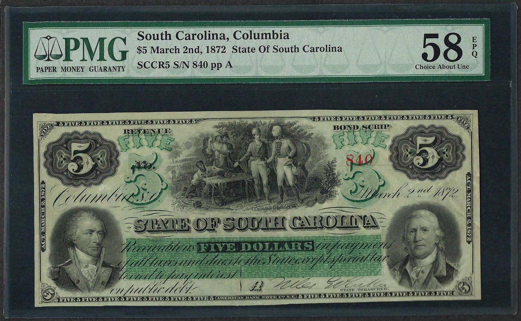 One 1872 $5 State of South Carolina Obsolete Note PMG Choice About Uncirculated 58EPQ. PMG Certified.