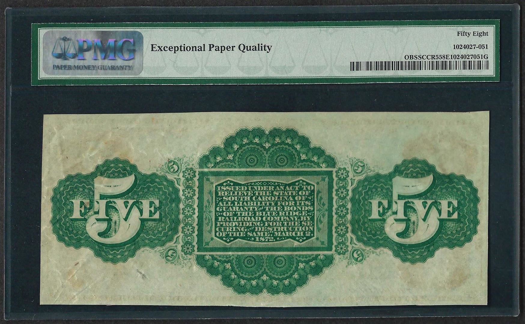 1872 $5 State of South Carolina Obsolete Note PMG Choice About Uncirculated 58EP