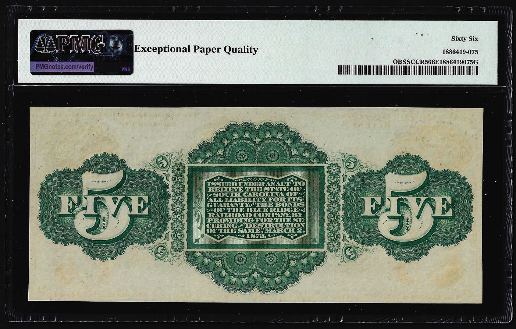 One 1872 $5 State of South Carolina Obsolete Note PMG Gem Uncirculated 66EPQ. PMG Certified.