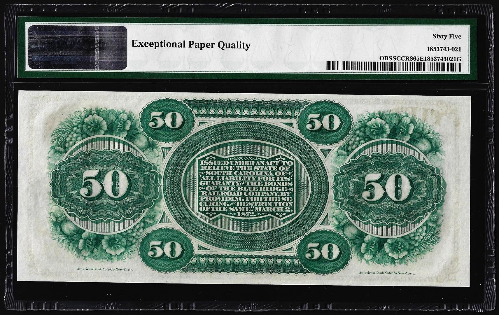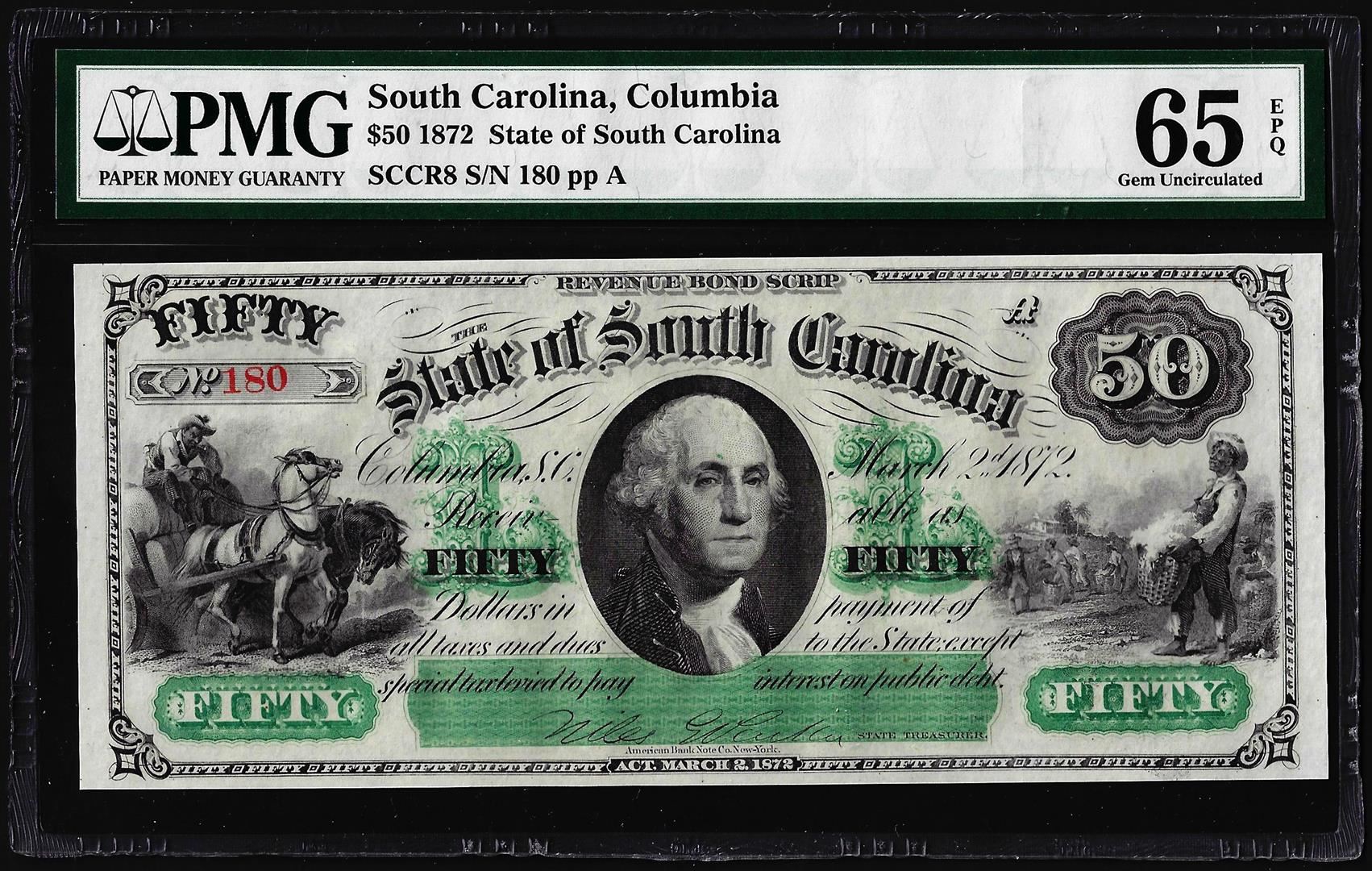 One 1872 $50 State of South Carolina Obsolete Note PMG Gem Uncirculated 65EPQ. PMG Certified.