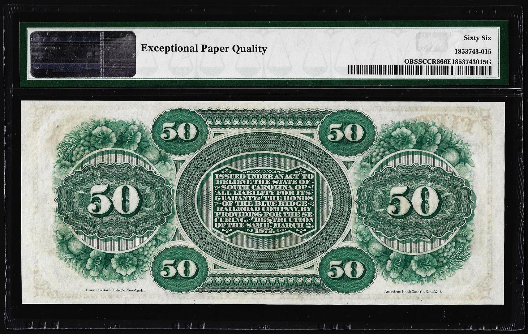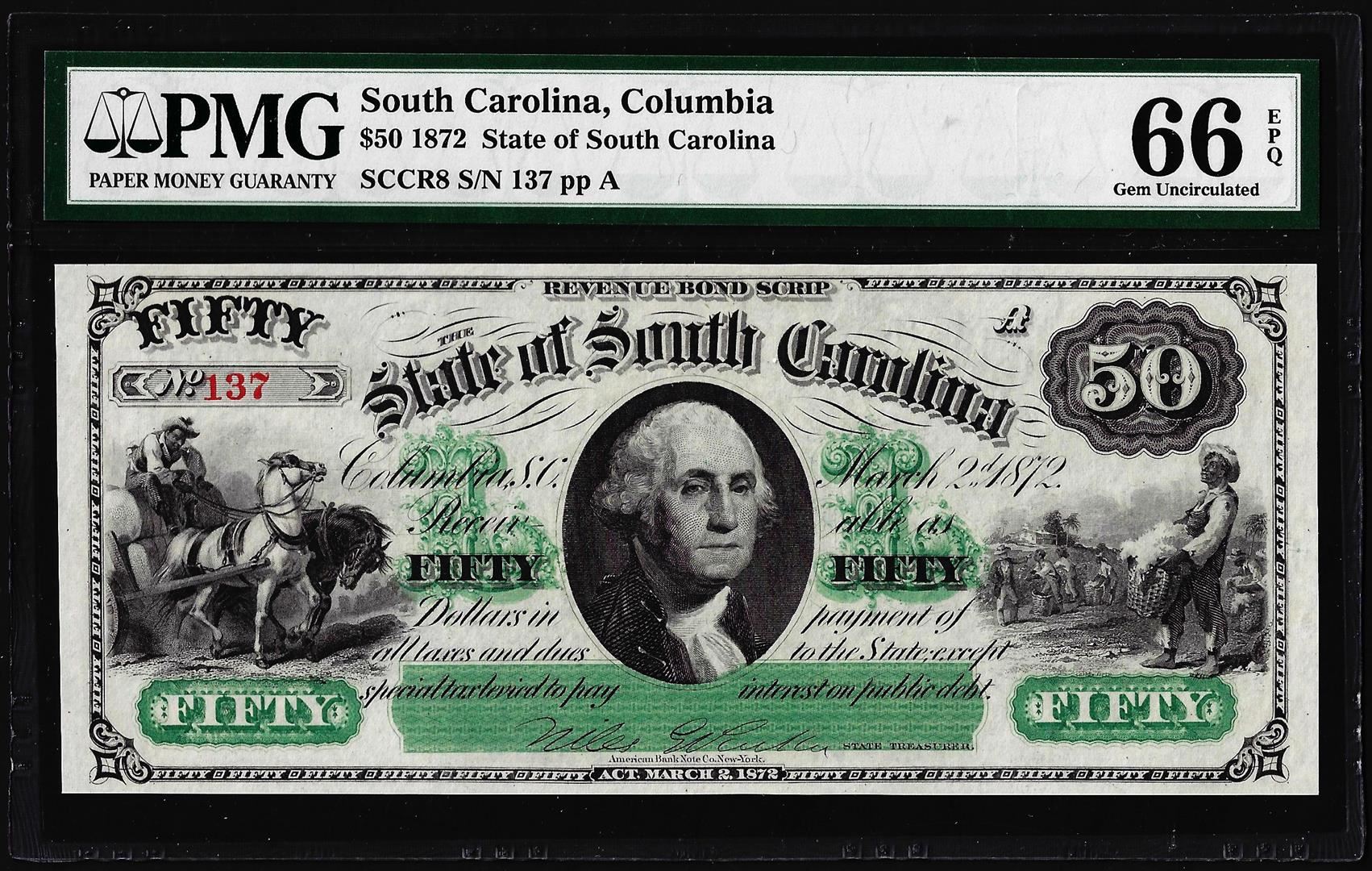 One 1872 $50 State of South Carolina Obsolete Note PMG Gem Uncirculated 66EPQ. PMG Certified.