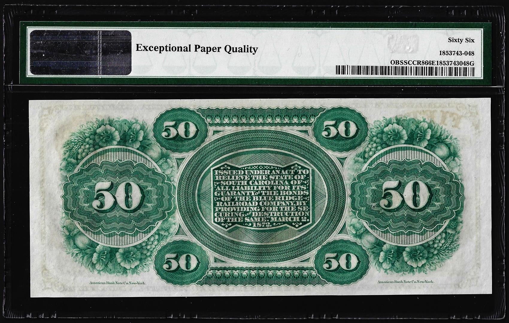 One 1872 $50 State of South Carolina Obsolete Note PMG Gem Uncirculated 66EPQ. PMG Certified.