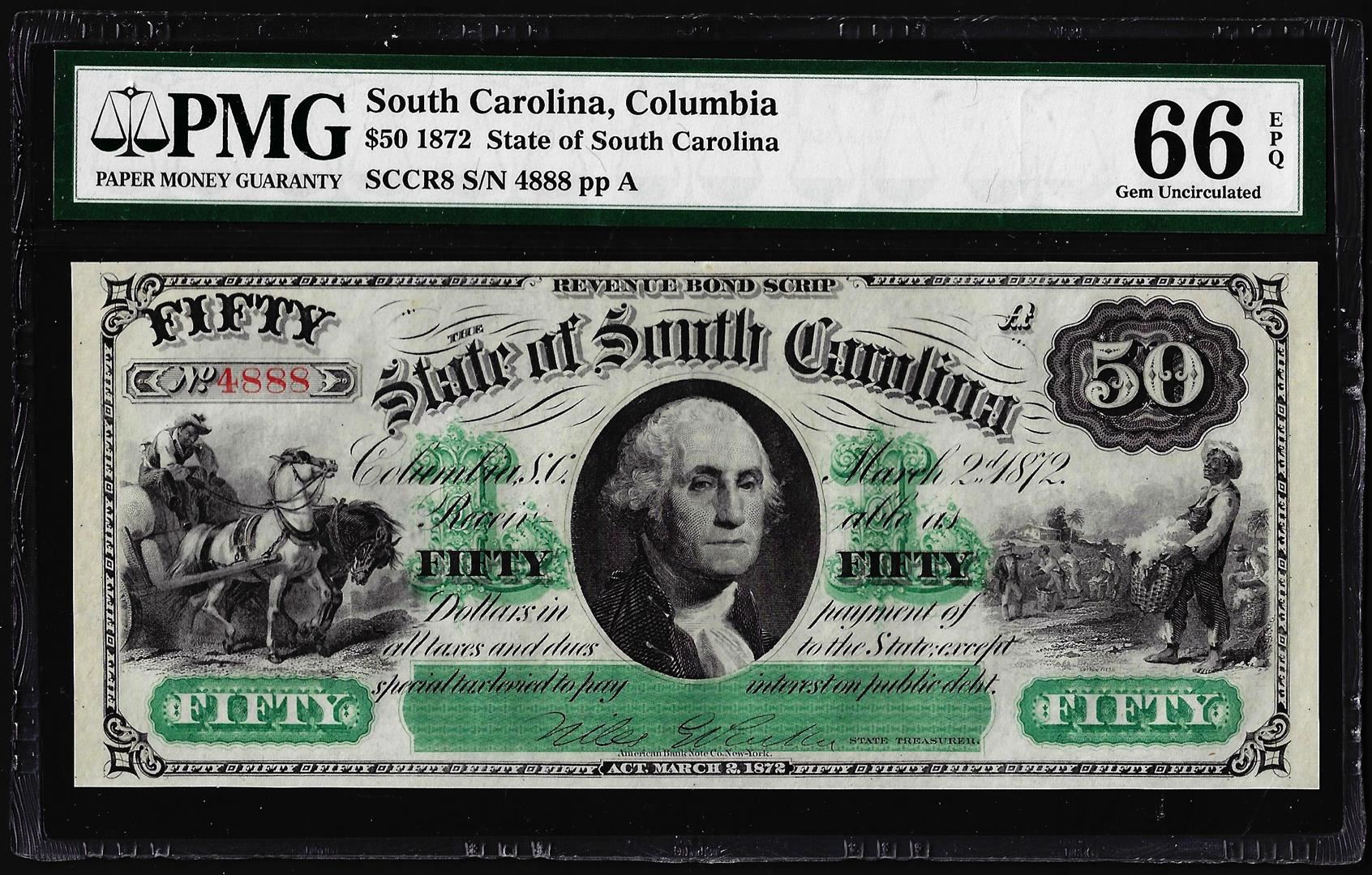 One 1872 $50 State of South Carolina Obsolete Note PMG Gem Uncirculated 66EPQ. PMG Certified.