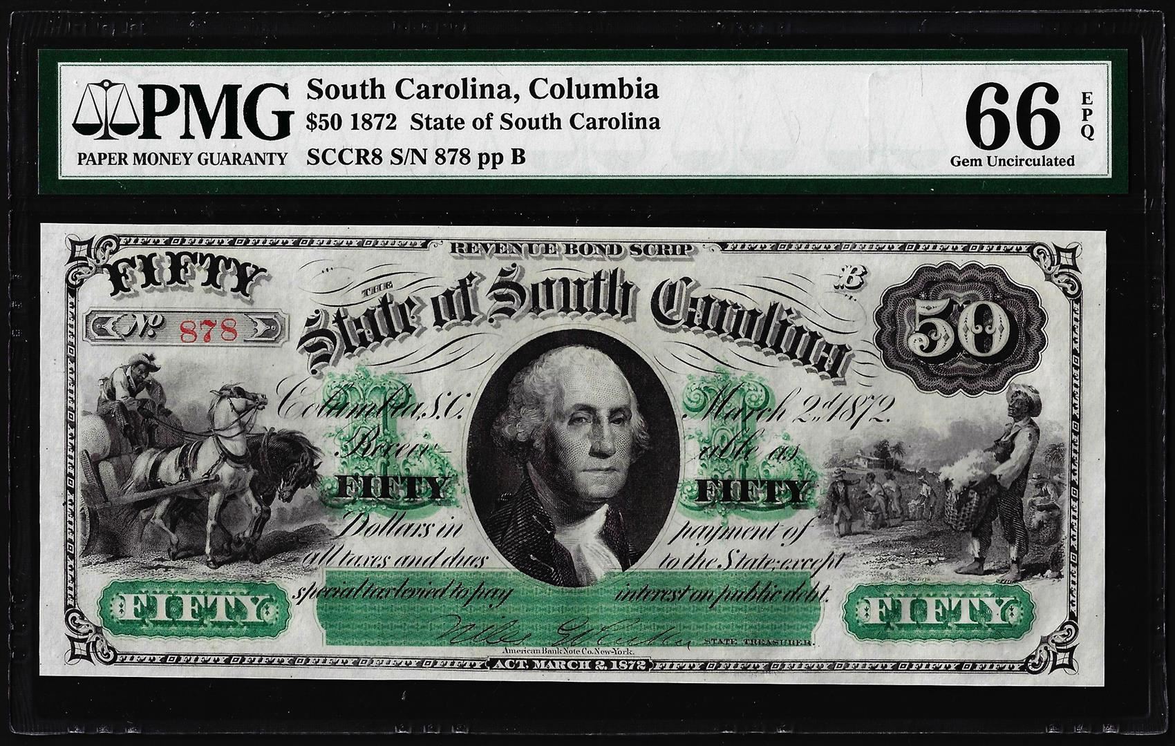 One 1872 $50 State of South Carolina Obsolete Note PMG Gem Uncirculated 66EPQ. PMG Certified.