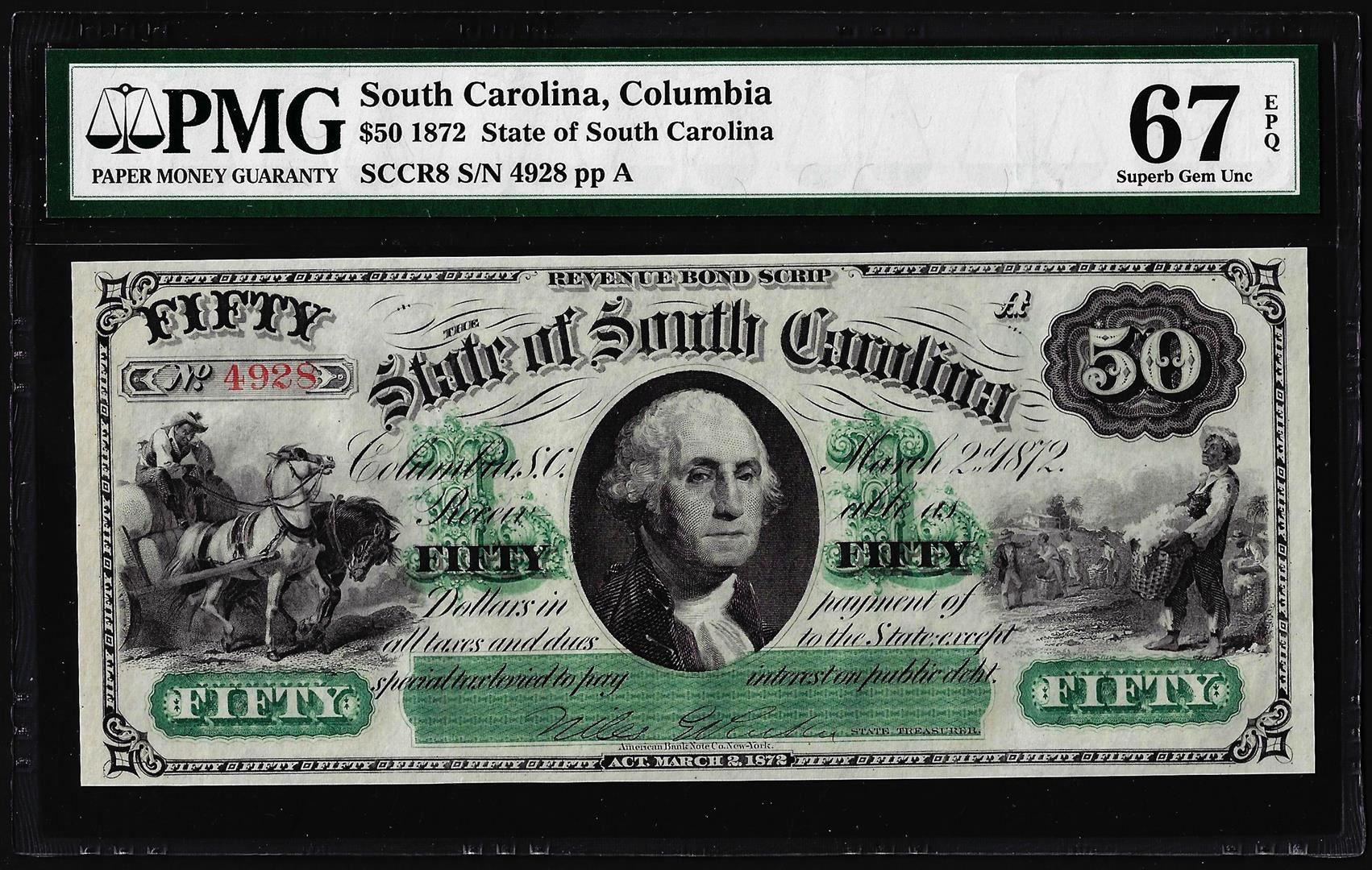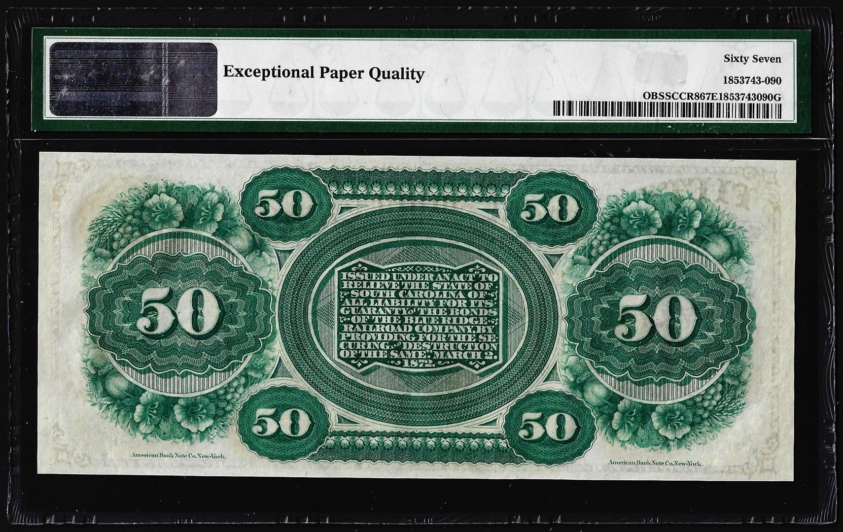 One 1872 $50 State of South Carolina Obsolete Note PMG Superb Gem Unc 67EPQ. PMG Certified.