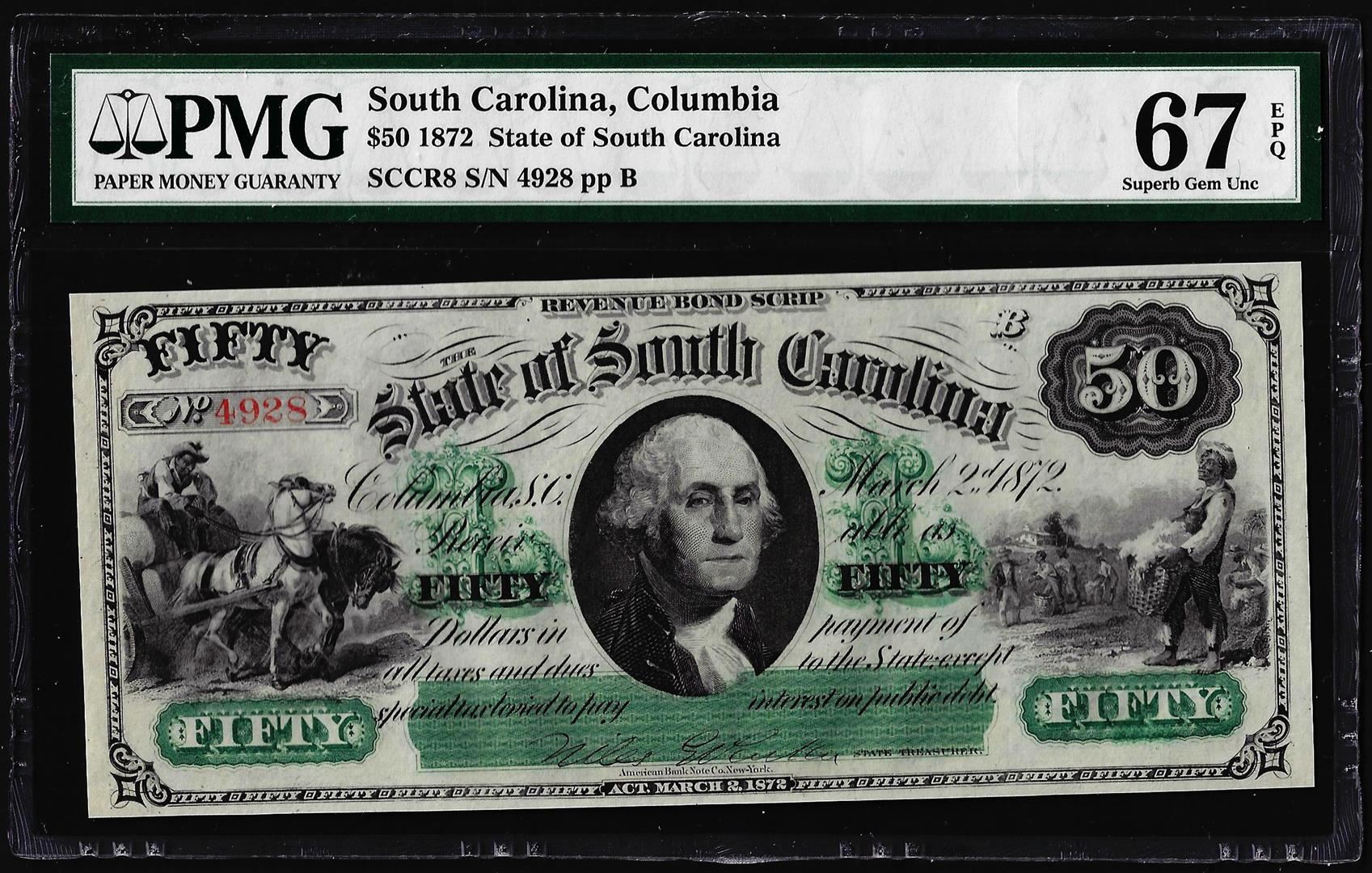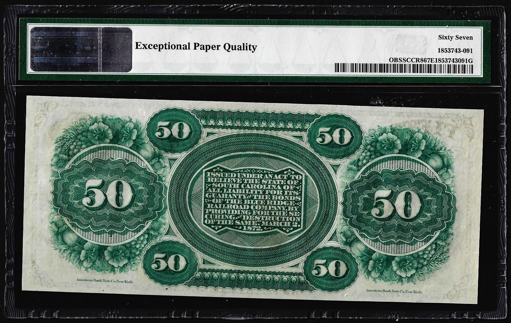 One 1872 $50 State of South Carolina Obsolete Note PMG Superb Gem Unc 67EPQ. PMG Certified.