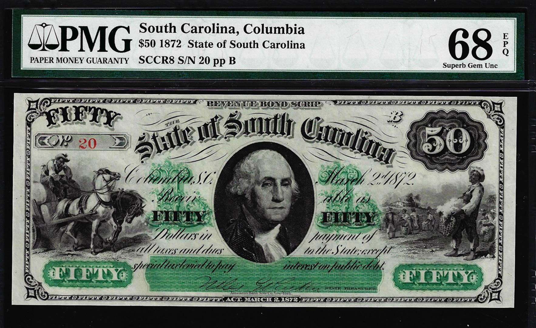1872 $50 State of South Carolina Obsolete Note PMG Superb Gem Unc. 68EPQ Low Serial