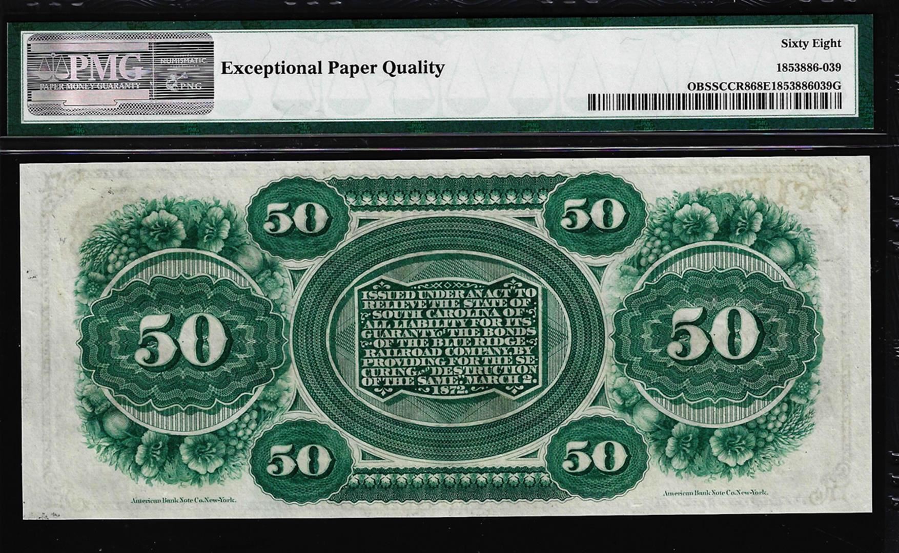 One 1872 $50 State of South Carolina Obsolete Note PMG Superb Gem Unc. 68EPQ Low Serial. PMG Certified.