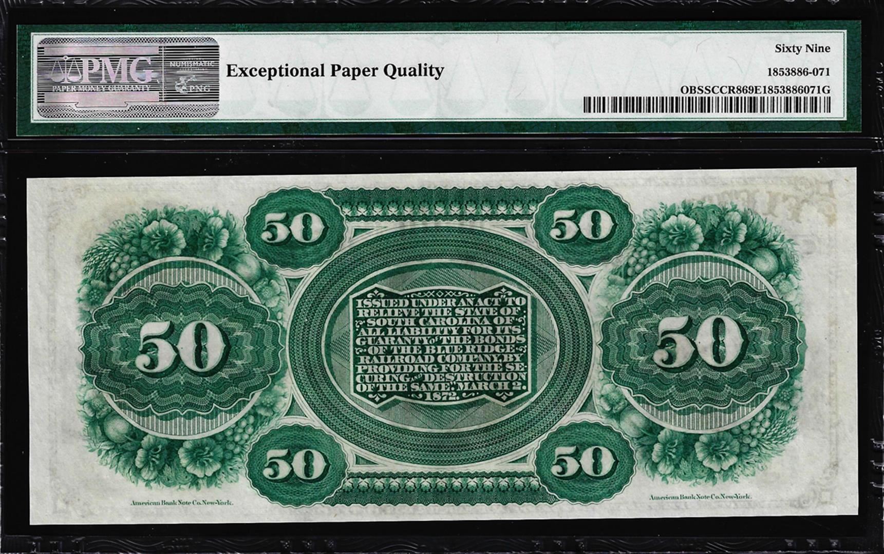 One 1872 $50 State of South Carolina Obsolete Note PMG Superb Gem Uncirculated 69EPQ. PMG Certified.
