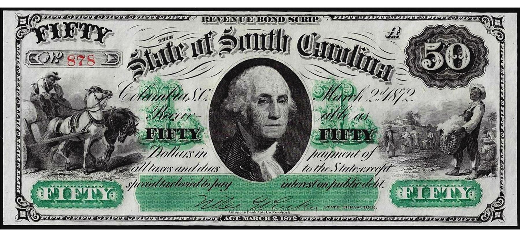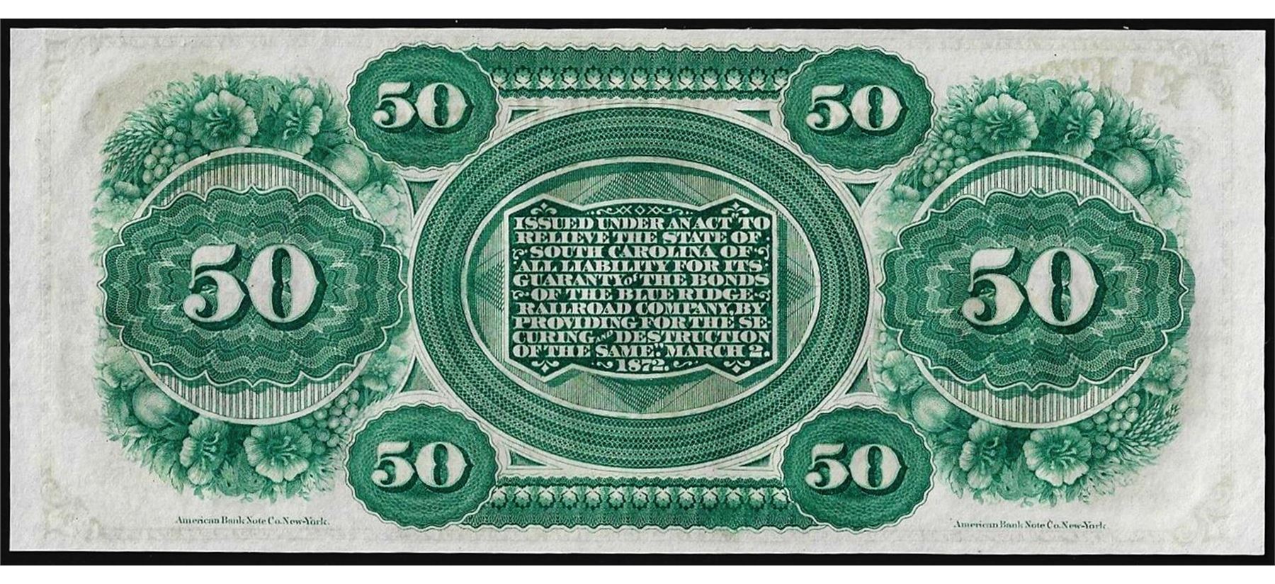 1872 $50 State of South Carolina Revenue Bond Obsolete Note Low Serial Number