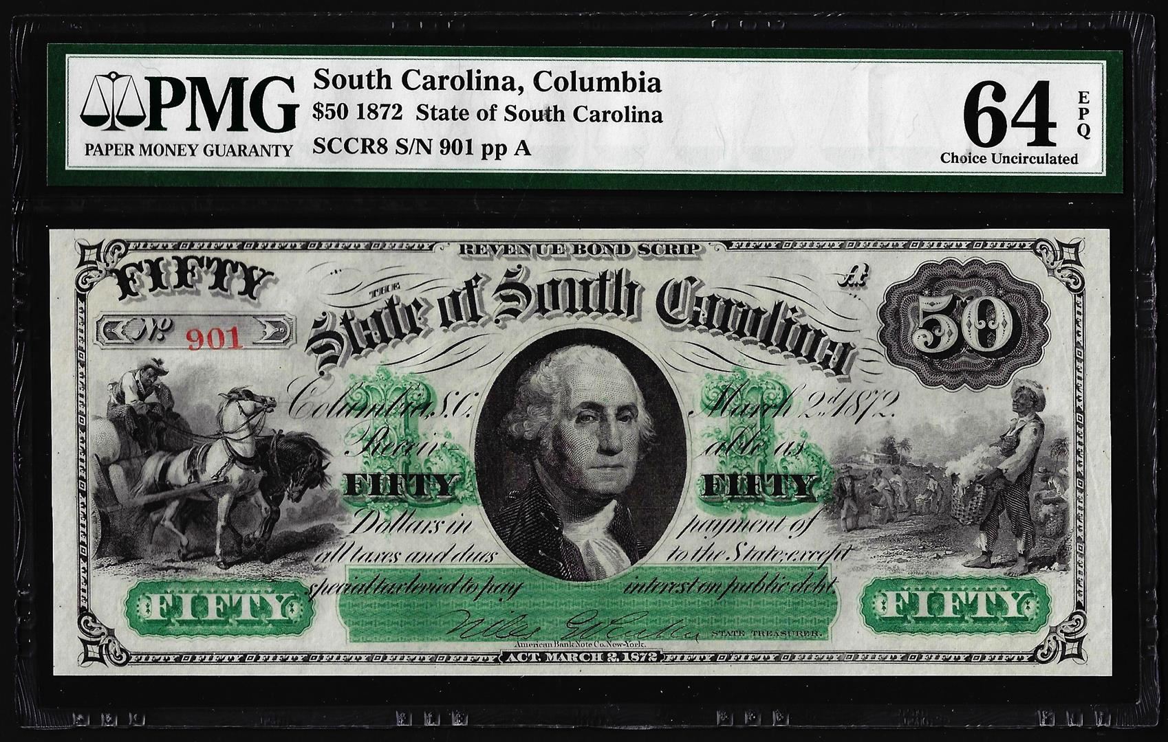 1872 $50 State of South Carolina Revenue Bond Obsolete Note PMG Ch. Uncirculated 64EPQ