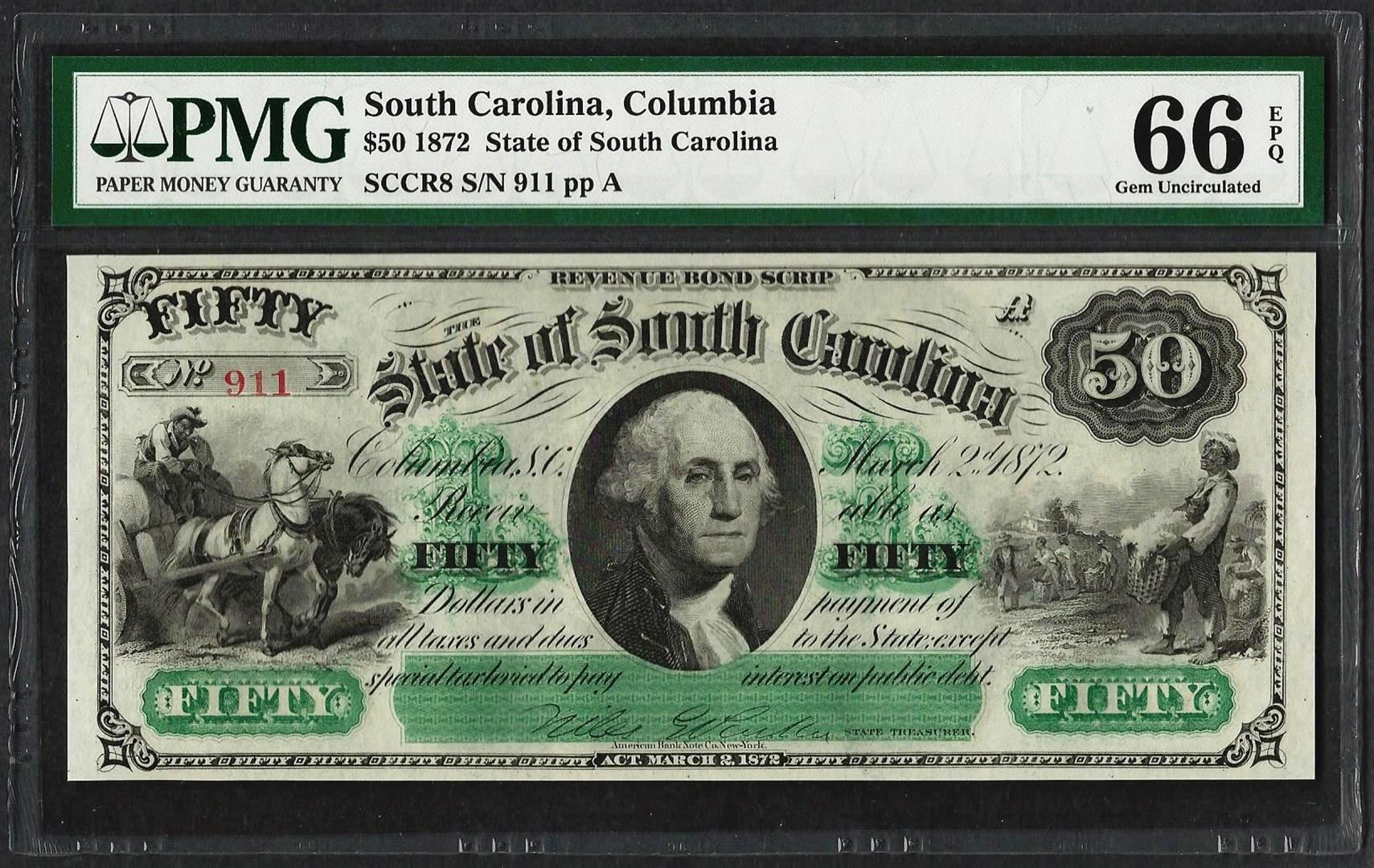 1872 $50 State of South Carolina Revenue Bond Obsolete Note PMG Gem Uncirculated 66EPQ