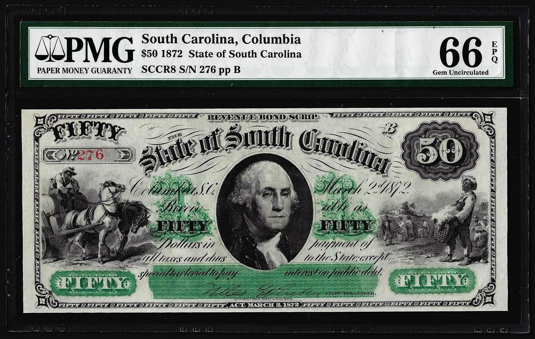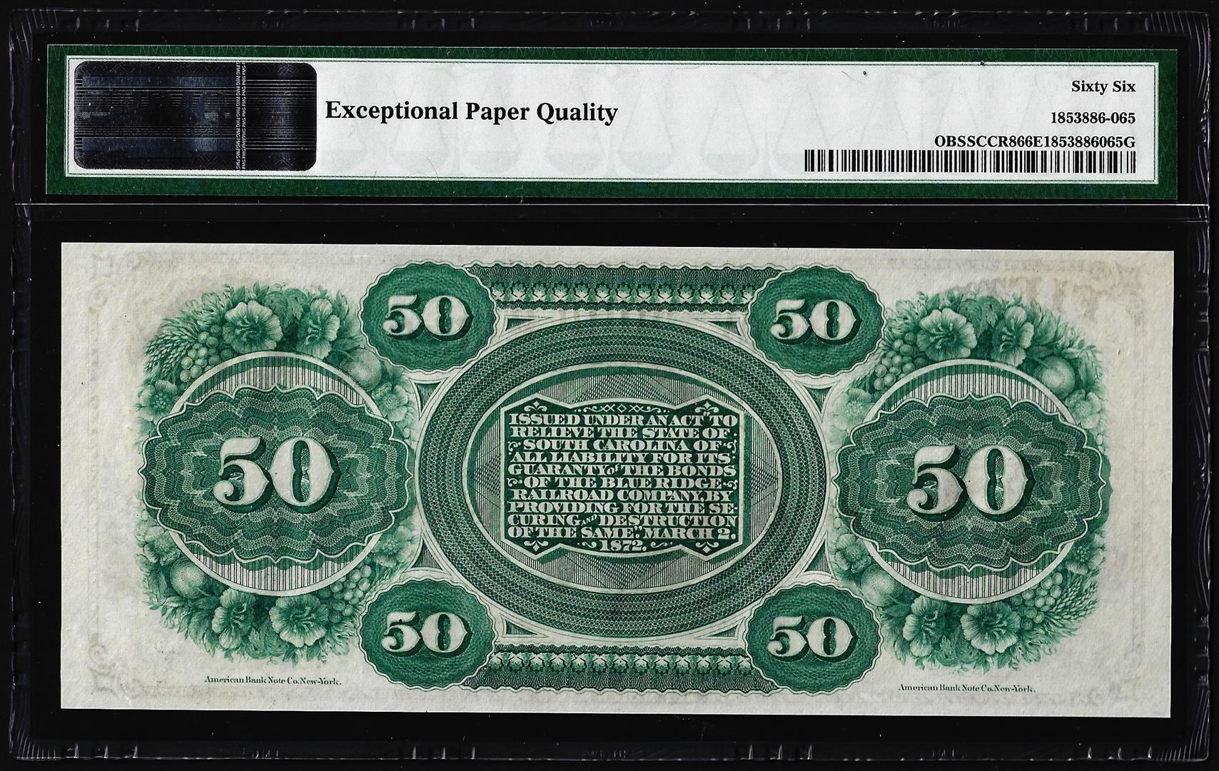1872 $50 State of South Carolina Revenue Bond Obsolete Note PMG Gem Uncirculated 66EPQ