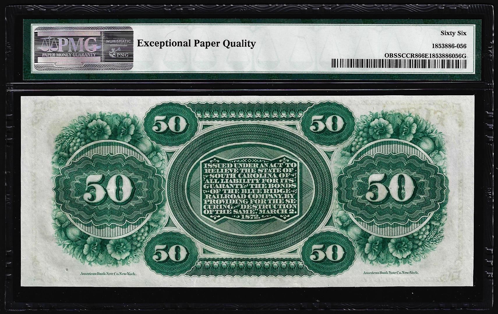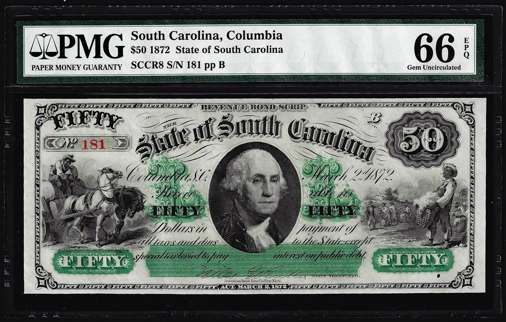 1872 $50 State of South Carolina Revenue Bond Obsolete Note PMG Gem Uncirculated 66EPQ