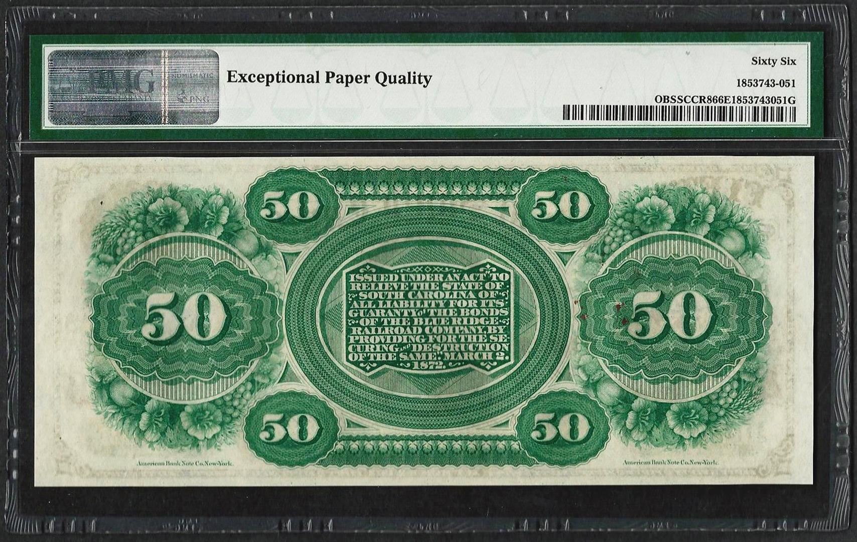 1872 $50 State of South Carolina Revenue Bond Obsolete Note PMG Gem Uncirculated 66EPQ