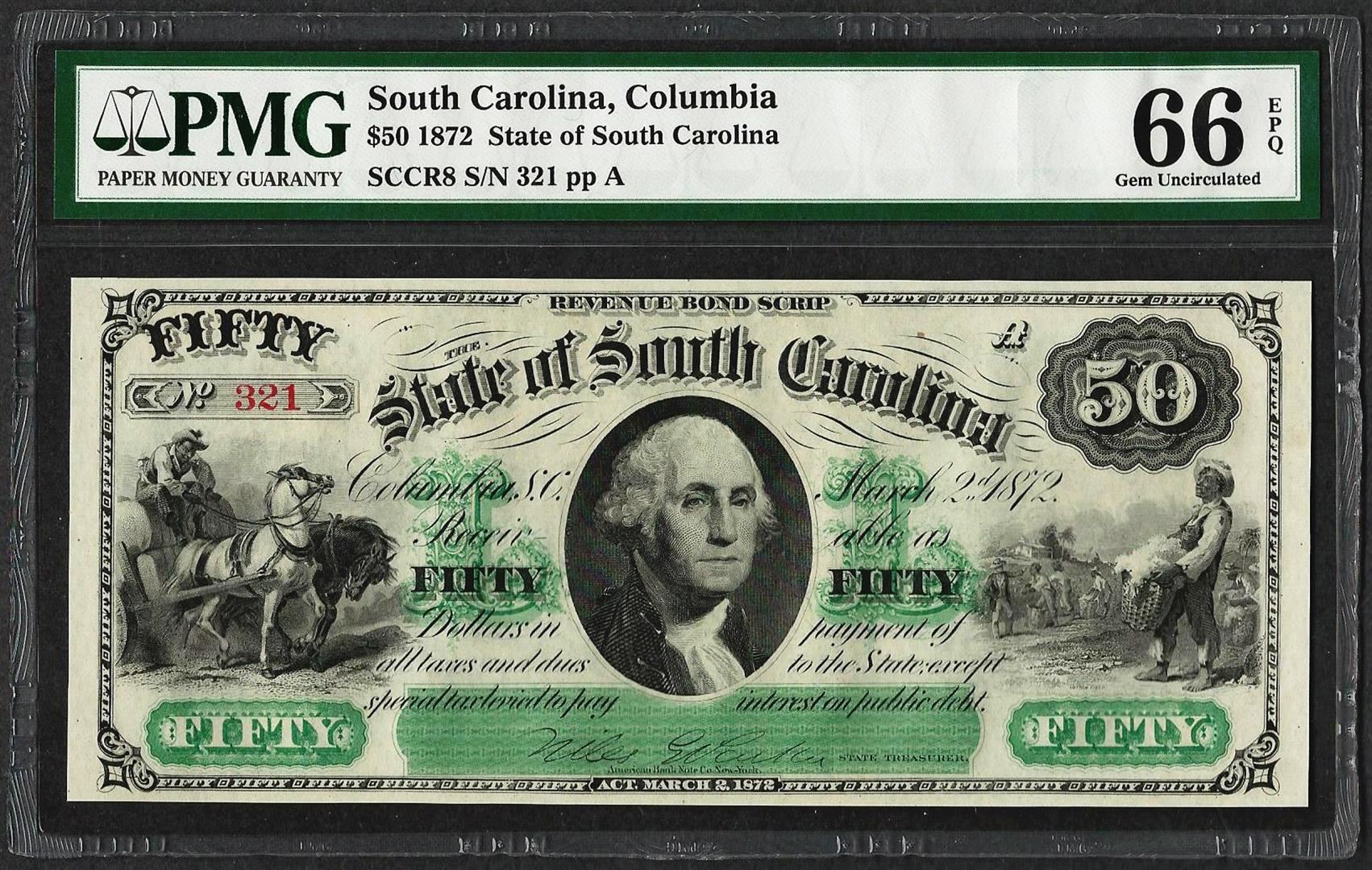 One 1872 $50 State of South Carolina Revenue Bond Obsolete Note PMG Gem Uncirculated 66EPQ. PMG Certified.