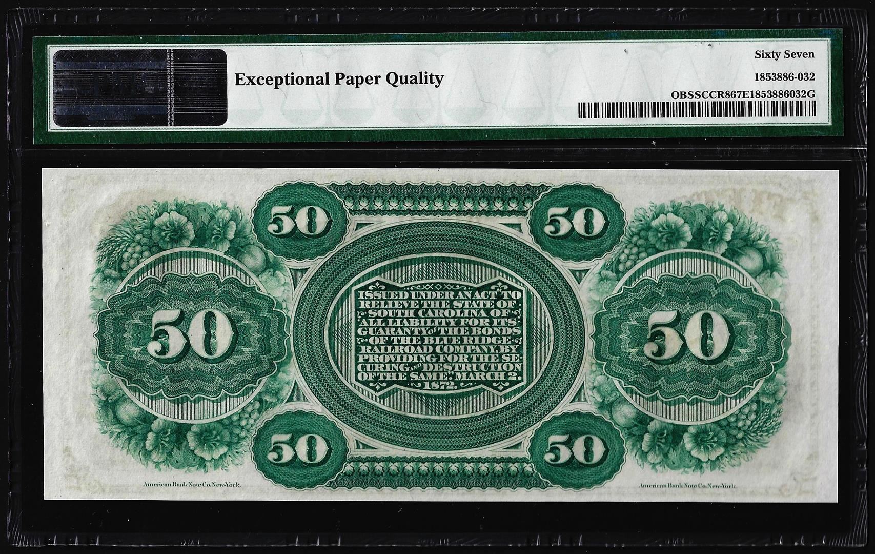 1872 $50 State of South Carolina Revenue Bond Obsolete Note PMG Superb Gem Unc. 67EPQ