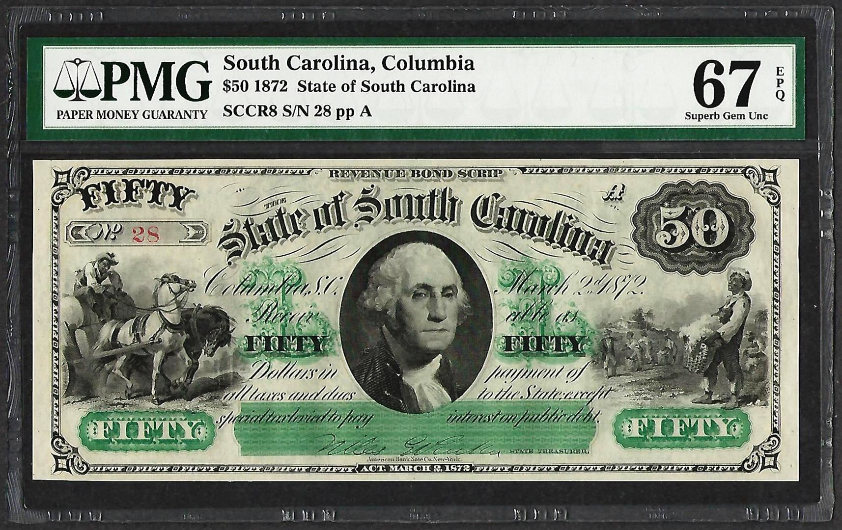1872 $50 State of South Carolina Revenue Bond Obsolete Note PMG Superb Gem Unc. 67EPQ