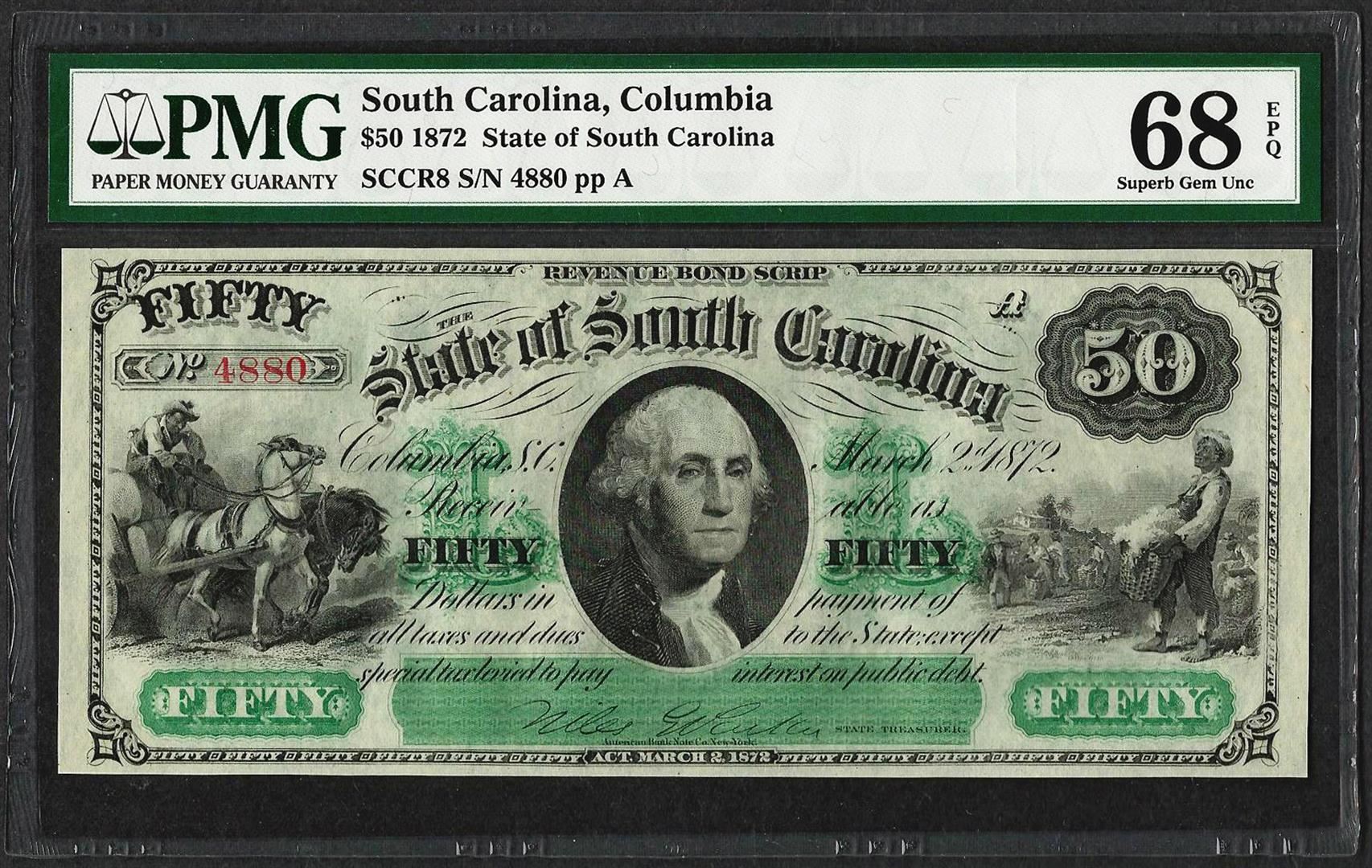 One 1872 $50 State of South Carolina Revenue Bond Obsolete Note PMG Superb Gem Unc. 68EPQ. PMG Certified.