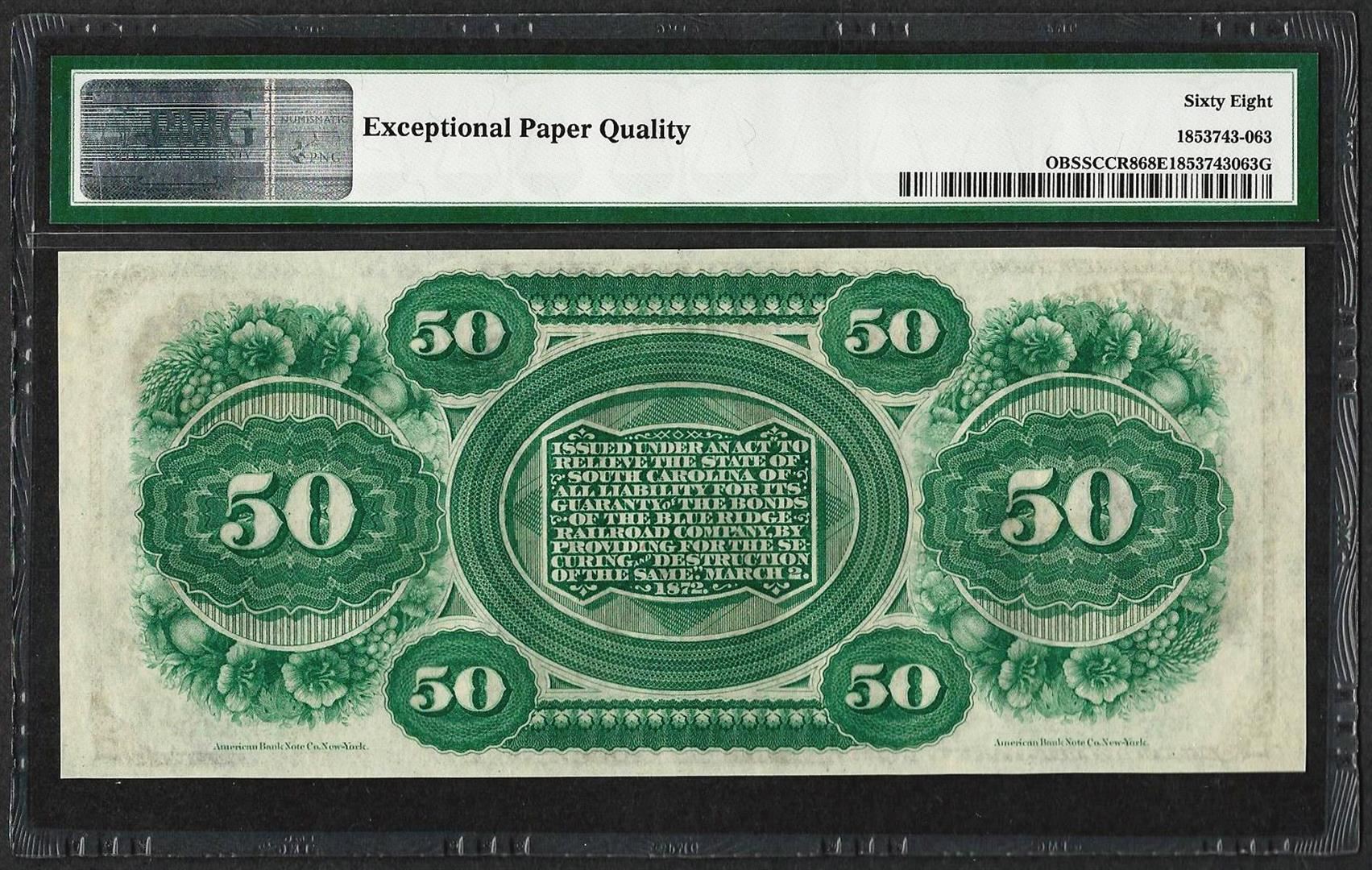1872 $50 State of South Carolina Revenue Bond Obsolete Note PMG Superb Gem Unc. 68EPQ