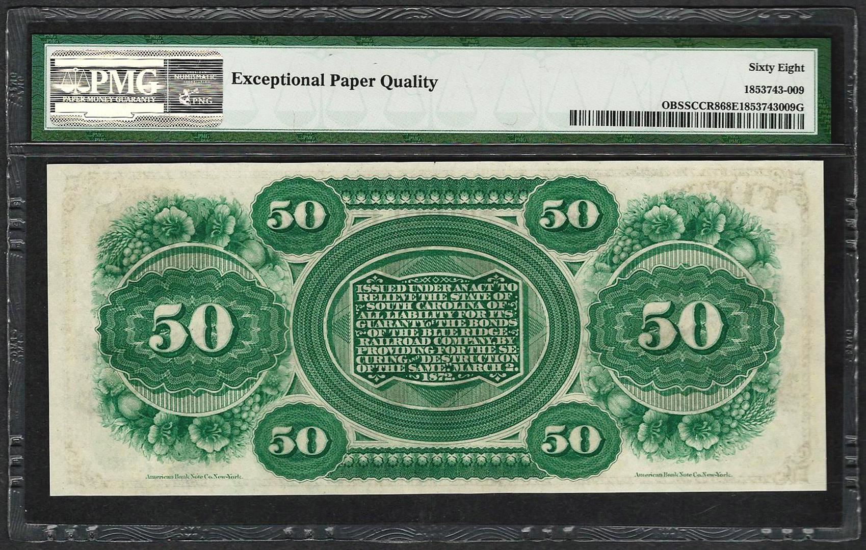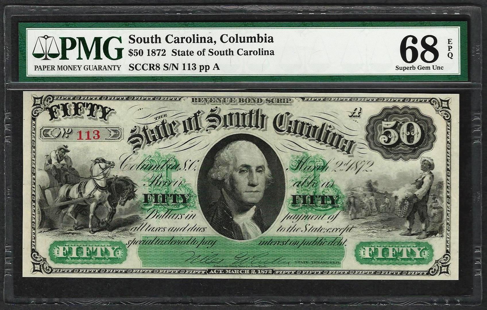 One 1872 $50 State of South Carolina Revenue Bond Obsolete Note PMG Superb Gem Unc. 68EPQ. PMG Certified.