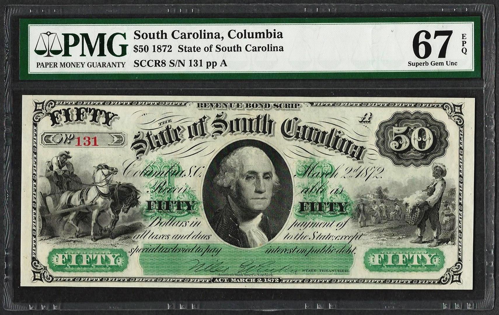 One 1872 $50 State of South Carolina Revenue Bond Obsolete Note PMG Superb Gem Unc. 67EPQ. PMG Certified.