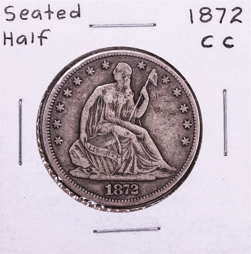 One 1872-CC Seated Liberty Half Dollar Coin.