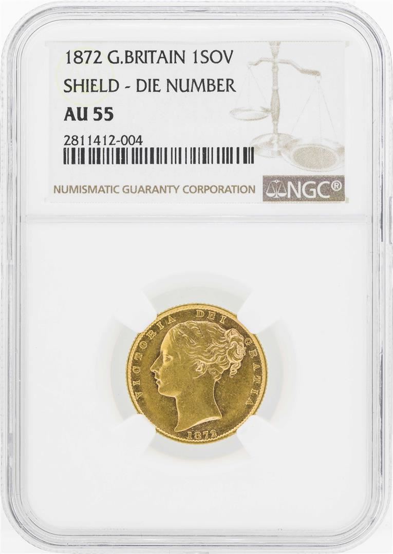 One 1872 Great Britain Sovereign Gold Coin NGC AU55. NGC Certified.