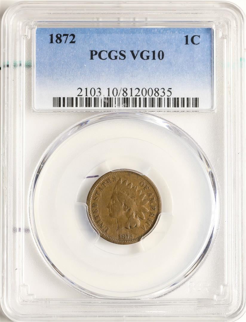 One 1872 Indian Head Cent Coin PCGS VG10. PCGS Graded.