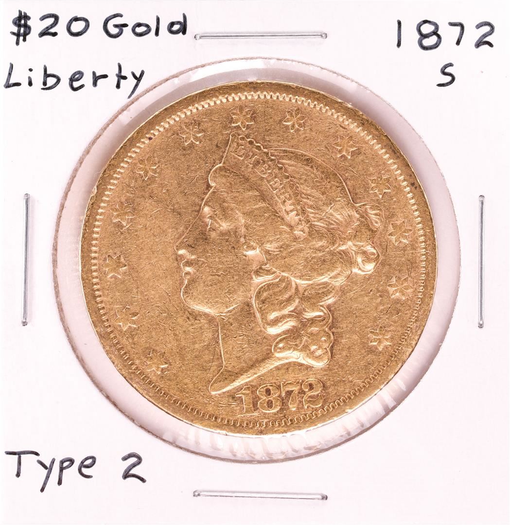 One 1872-S $20 Type 2 Liberty Head Double Eagle Gold Coin.