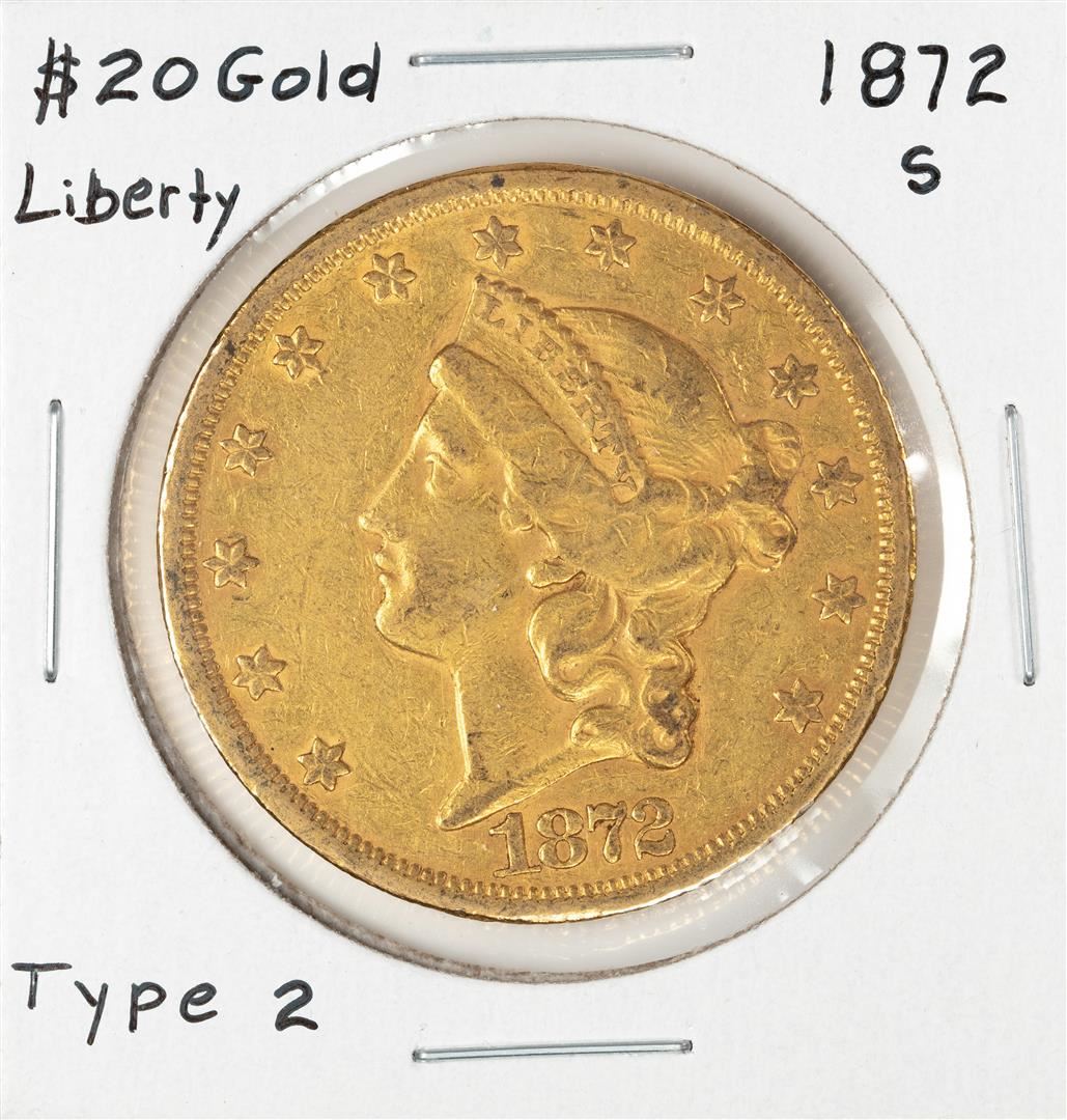 One 1872-S Type 2 $20 Liberty Head Double Eagle Gold Coin.