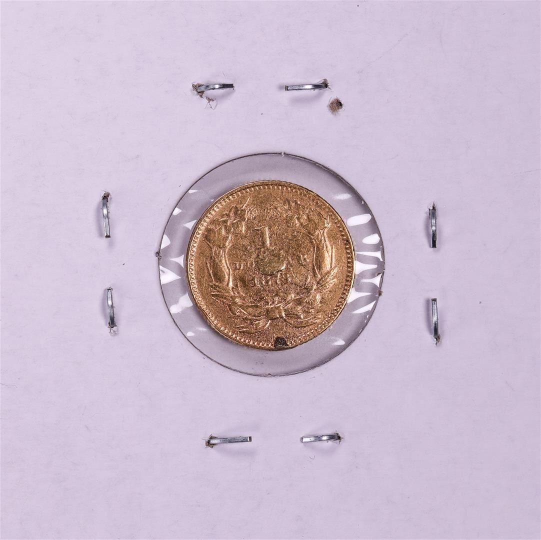One 1873 $1 Indian Princess Head Gold Dollar Coin, please note there is damage to the reverse above the date and at the 6 O'clock position as shown in the pictures.