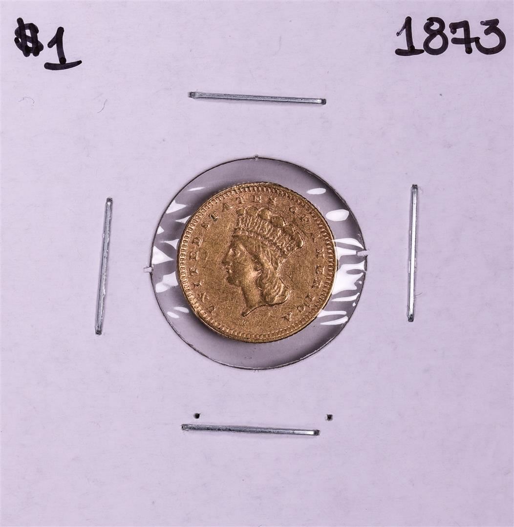 One 1873 $1 Indian Princess Head Gold Dollar Coin, please note there is damage to the reverse above the date and at the 6 O'clock position as shown in the pictures.