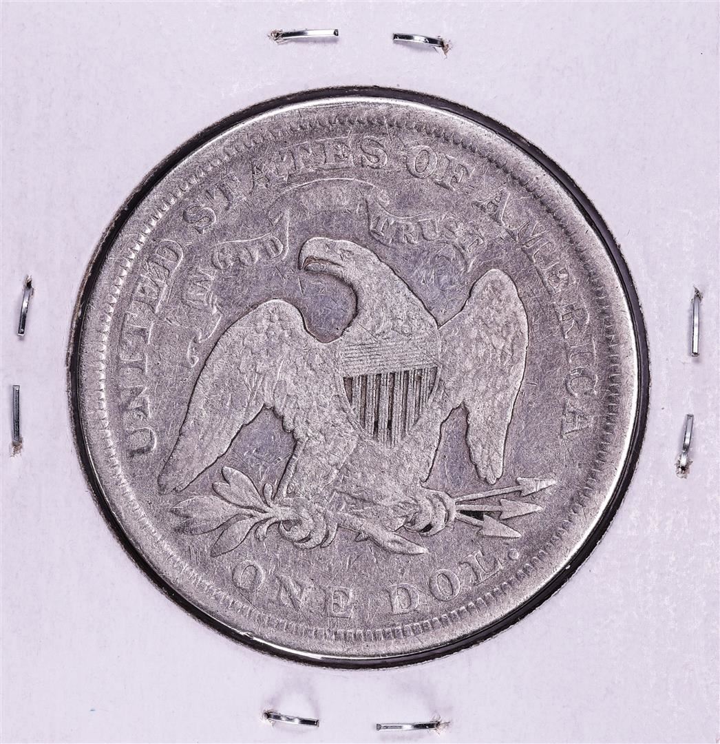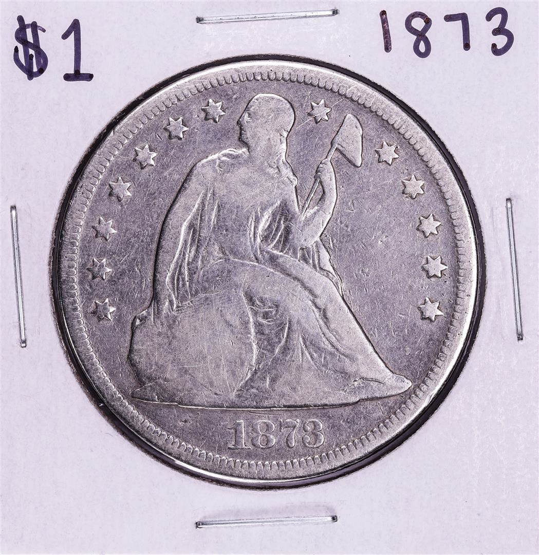 One 1873 $1 Seated Liberty Silver Dollar Coin.