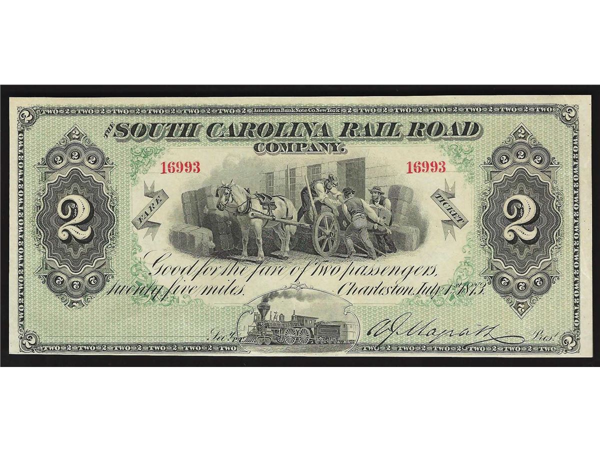 One 1873 $2 South Carolina Rail Road Company Obsolete Note.