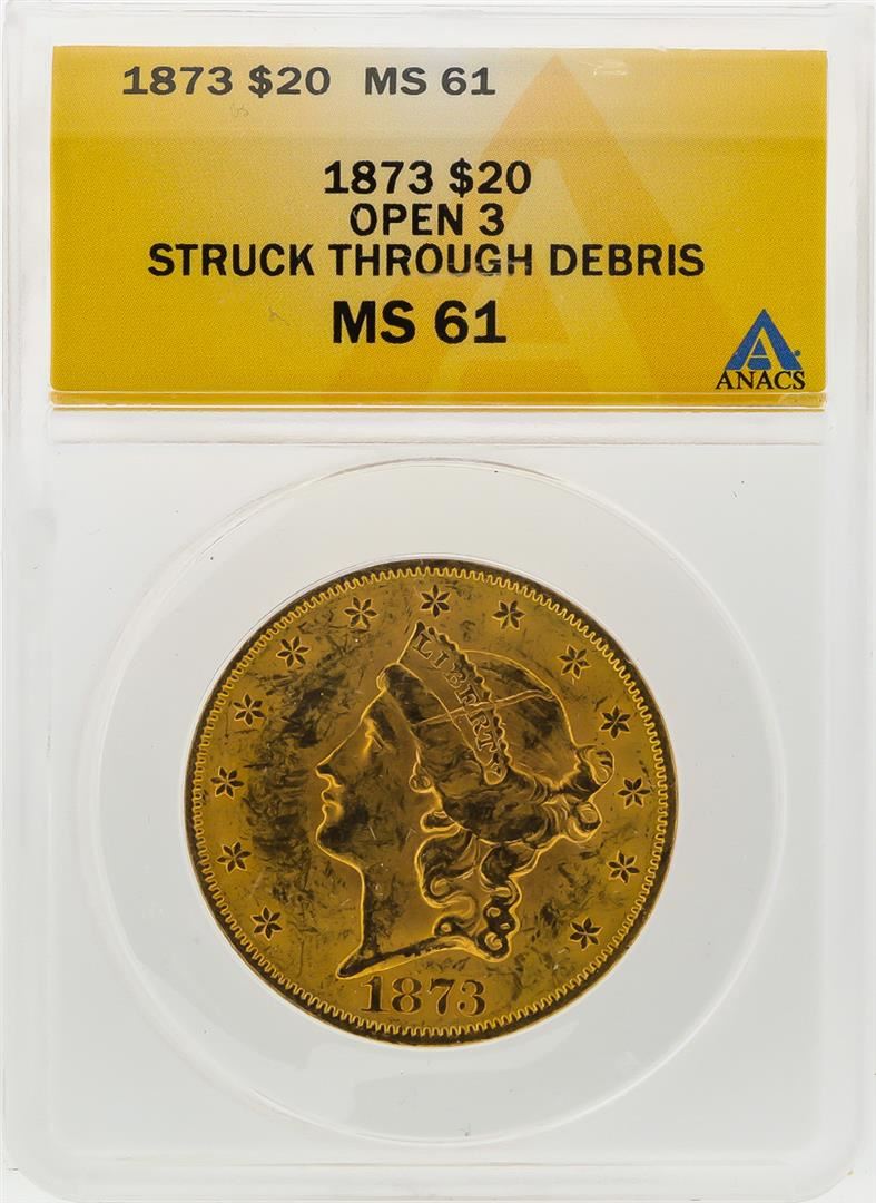 One 1873 $20 Liberty Head Double Eagle Gold Coin ANACS MS61 Open 3. ANACS Certified.