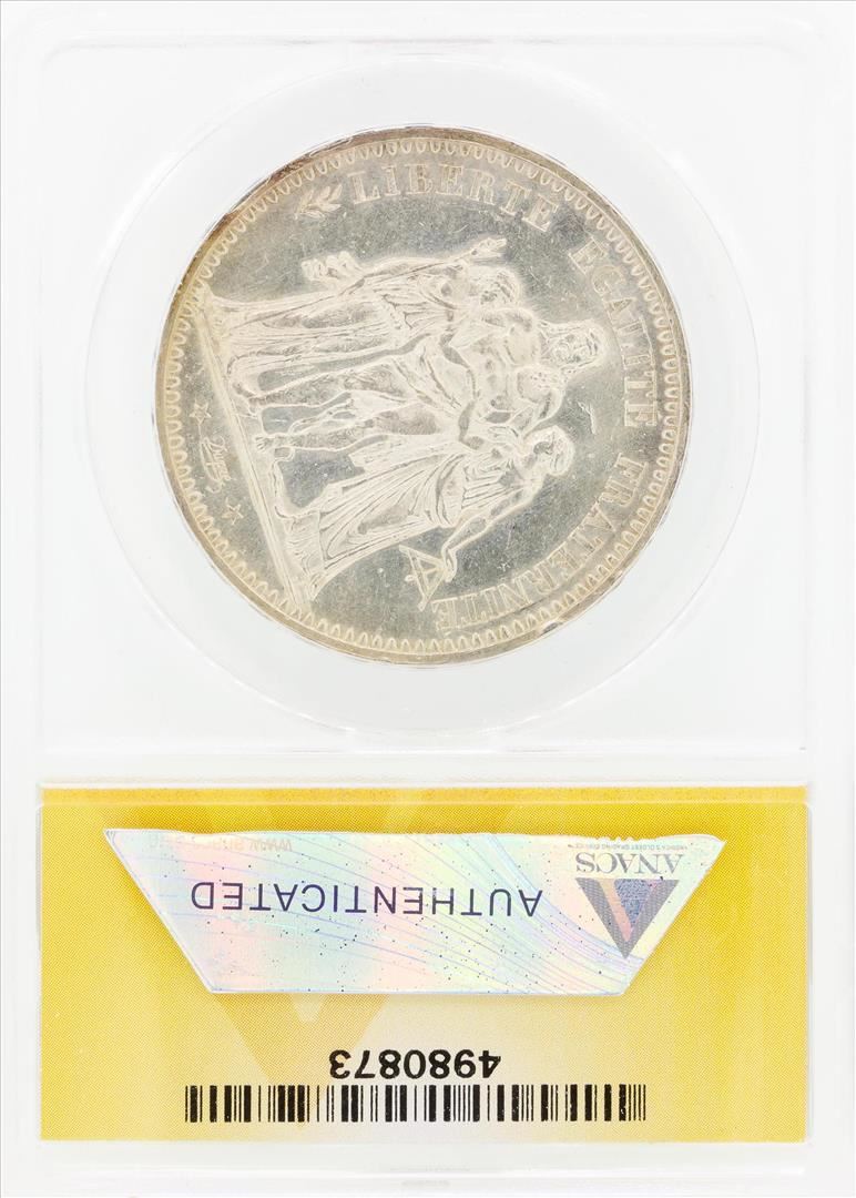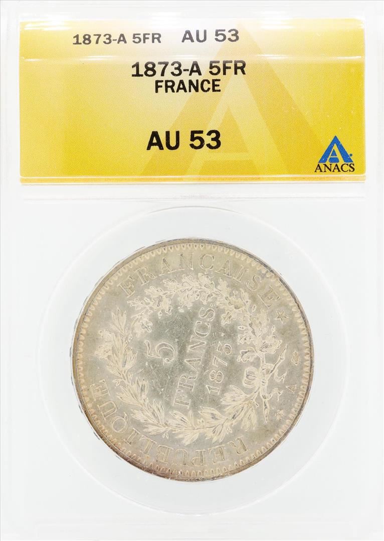 One 1873-A 5 Francs Silver Coin ANACS AU53. ANACS Certified.