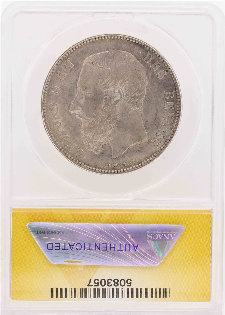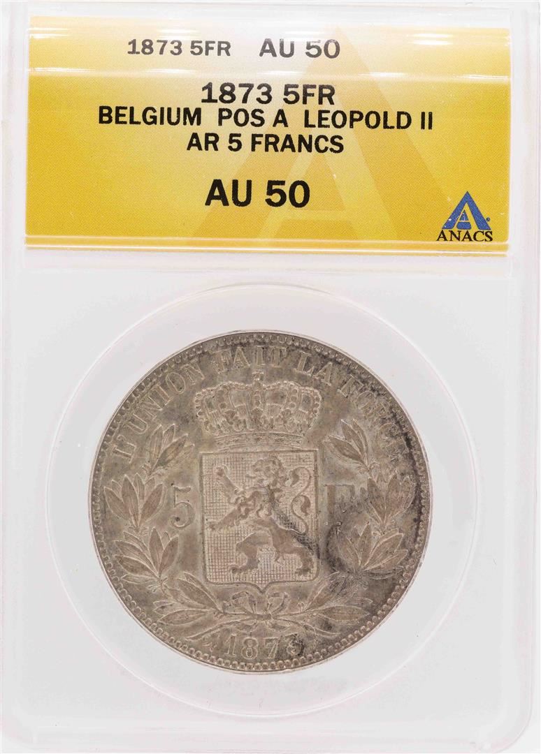 One 1873 Belgium POS A Leopold II AR 5 Francs Coin ANACS AU50. ANACS Certified.