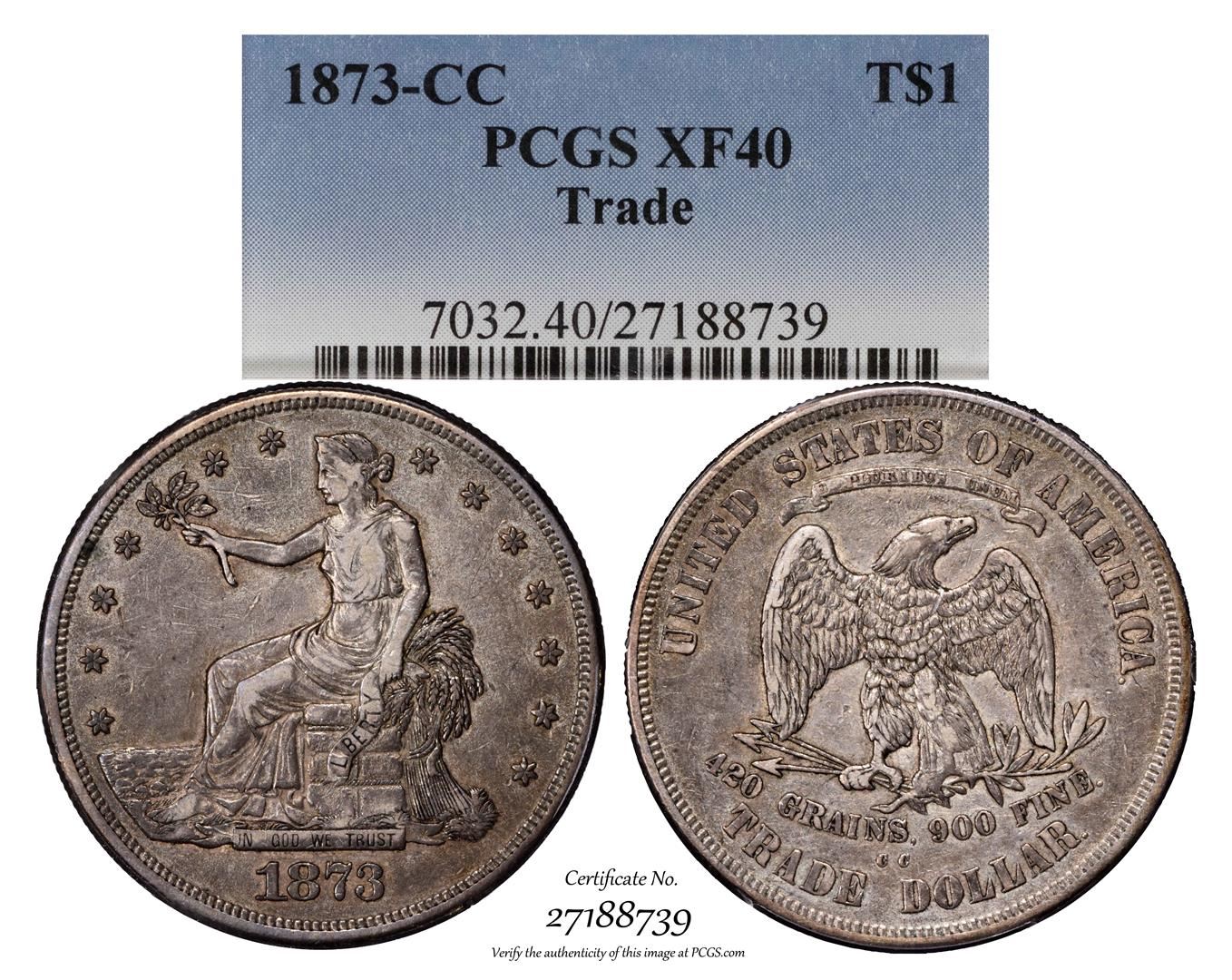 One 1873-CC $1 Trade Silver Dollar Coin PCGS XF40. PCGS Graded.