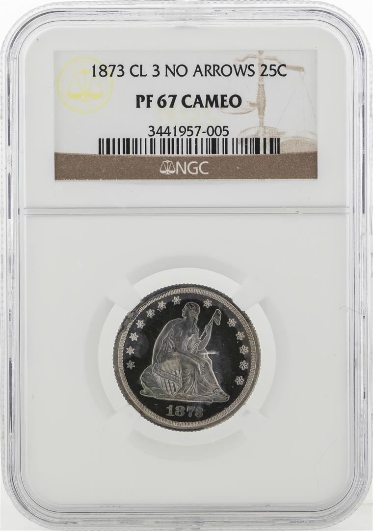One 1873-CL 3 No Arrow Quarter Dollar Coin NGC PF67 Cameo. 1873 quarter dollar is the highest graded with a population of only 2. NGC Certified.