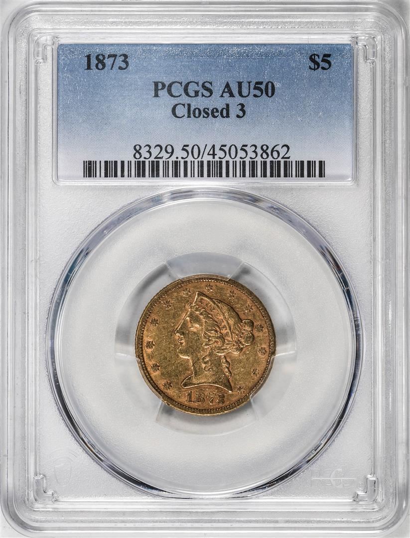 One 1873 Closed 3 $5 Liberty Head Half Eagle Gold Coin PCGS AU50. PCGS Graded.
