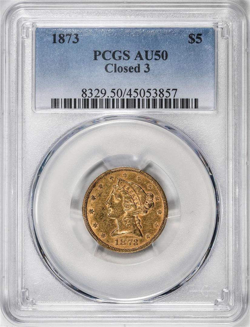 One 1873 Closed 3 $5 Liberty Head Half Eagle Gold Coin PCGS AU50. PCGS Graded.