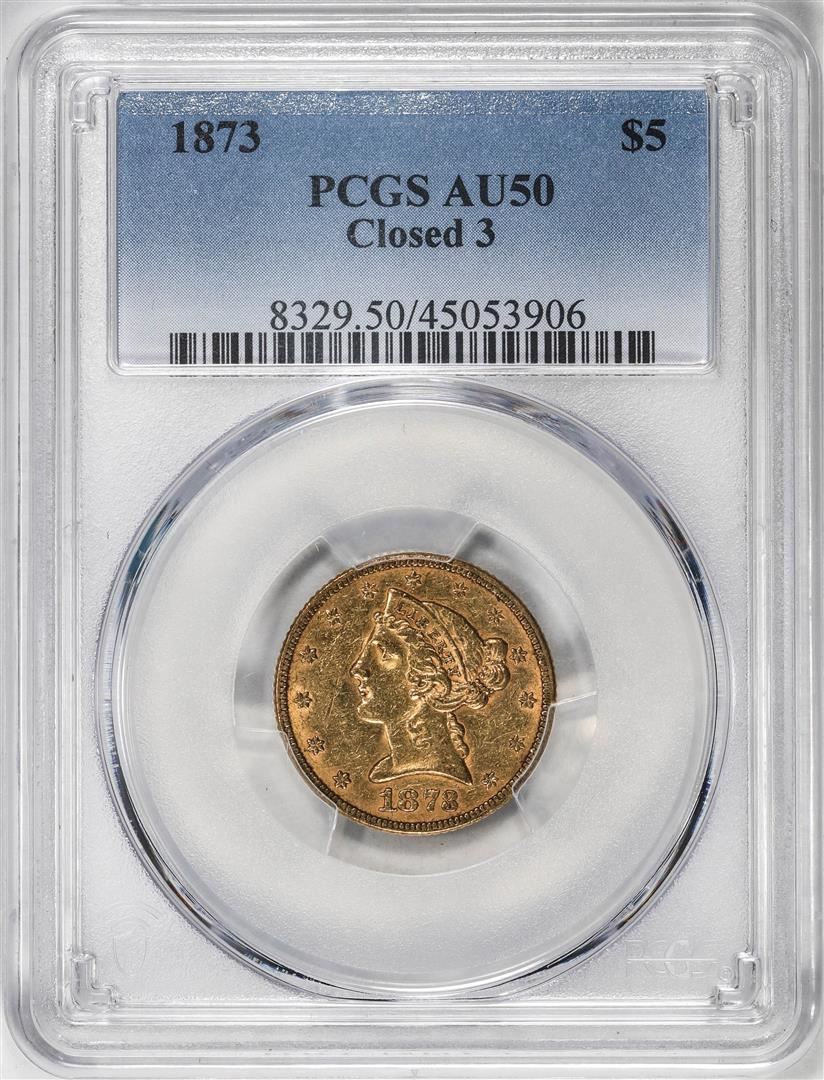 One 1873 Closed 3 $5 Liberty Head Half Eagle Gold Coin PCGS AU50. PCGS Graded.