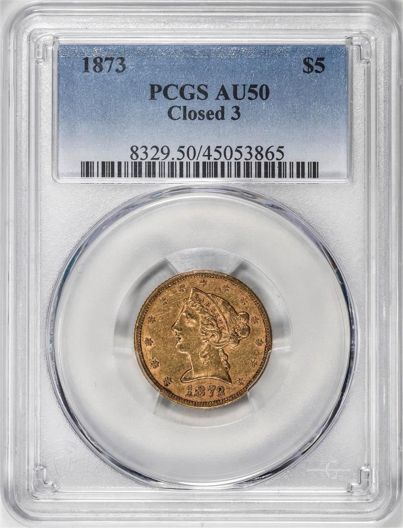 One 1873 Closed 3 $5 Liberty Head Half Eagle Gold Coin PCGS AU50. PCGS Graded.