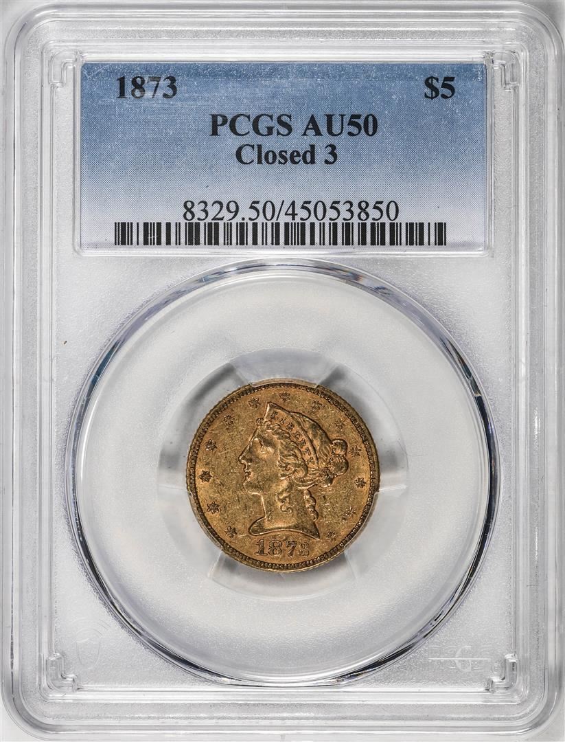 One 1873 Closed 3 $5 Liberty Head Half Eagle Gold Coin PCGS AU50. PCGS Graded.