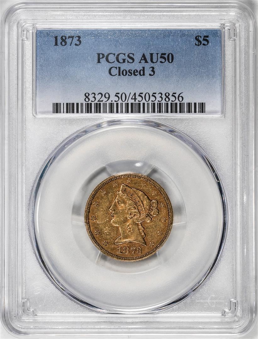 One 1873 Closed 3 $5 Liberty Head Half Eagle Gold Coin PCGS AU50. PCGS Graded.