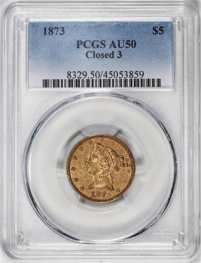 One 1873 Closed 3 $5 Liberty Head Half Eagle Gold Coin PCGS AU50. PCGS Graded.