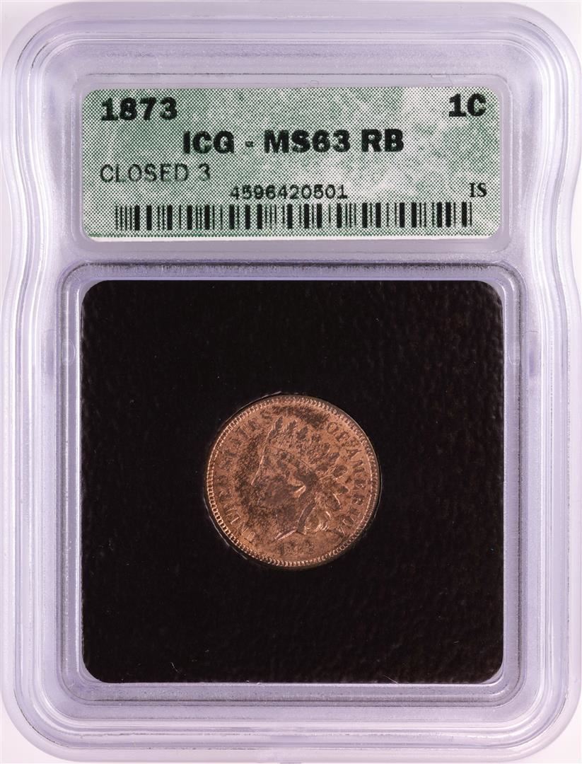 One 1873 Closed 3 Indian Head Cent Coin ICG MS63RB. ICG Certified.