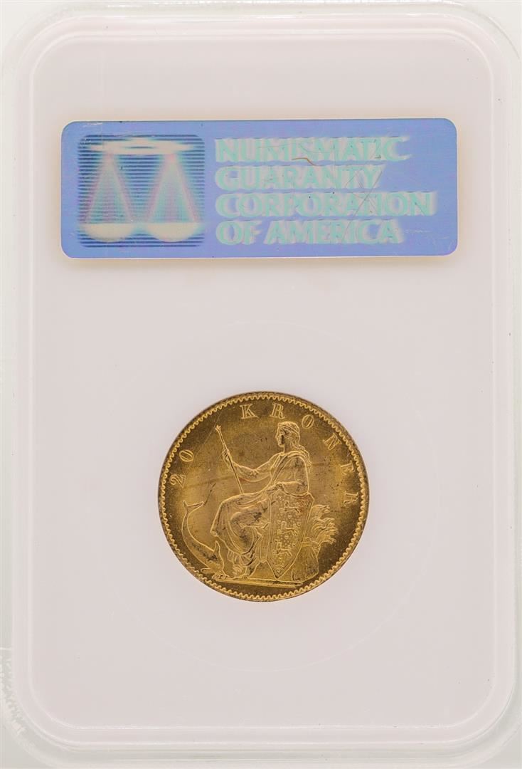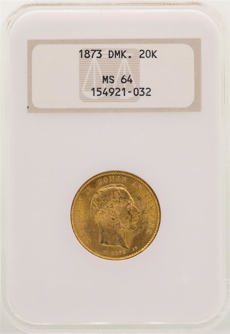 One 1873 Denmark 20 Kroners Gold Coin NGC MS64. NGC Certified.
